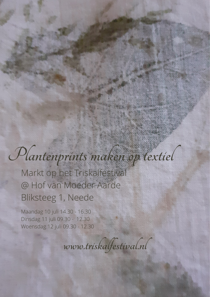 Kom tijdens het Triskal Festival je eigen plantenprints maken op textiel. Deze katoenen lapjes kun je daarna zelf omtoveren tot bijvoorbeeld een kussensloop of knikkerzakje. Voor de materiaalkosten staat er een donatiepot. De richtlijn is €0,50 per print. Voor iedereen die wil komen spelen en creëren met de natuur.